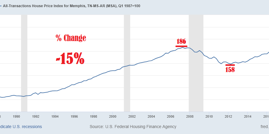Như chúng ta có thể thấy, Memphis đã vượt qua cơn bão một cách khá thận trọng. Hơn nữa, vì giá không giảm quá nghiêm trọng trong cuộc khủng hoảng tài chính, giá ở Memphis hiện đã vượt quá mức cao trước khủng hoảng tài chính rất nhiều, trong khi giá ở New York và Miami vẫn chưa phục hồi hoàn toàn. Nhìn lại xa hơn, chúng ta cũng có thể thấy sự biến động về giá cả ở San Francisco, Los Angeles và Thành phố New York sau cuộc suy thoái năm 1987, trong khi Memphis đã chứng kiến sự tăng trưởng ổn định cho đến khi cuộc Đại suy thoái bắt đầu giữ vững vào năm 2007 .